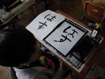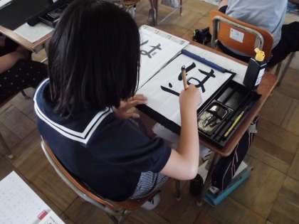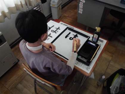 書写の授業で、「結び」の筆づかいに気をつけて、「はす」の字を書きました。