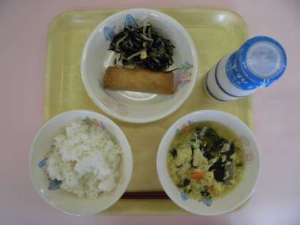 今日の献立は「ご飯・牛乳・卵スープ・愛知の青じそ入り春巻き・ひじきの中華サラダ」です。