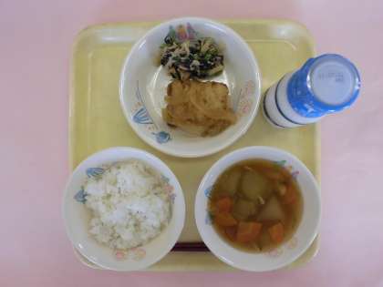 今日の献立は「ご飯・牛乳・とうがん汁・鶏たつたの愛知のたまねぎソース・ふるさと野菜のあえもの」です。
