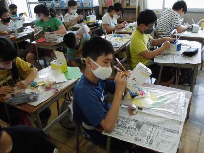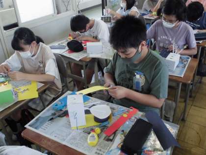 図工の授業で、「くるくるクランク」作品の制作を進めました。