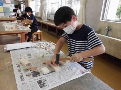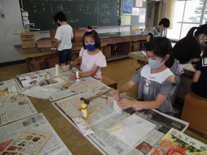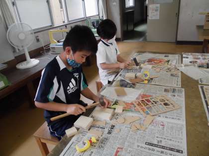 先週から図工では、「くぎうちトントン」の作品づくりに取り組んでいます。木片やボードを組み合わせて、飛行機やウサギなど思い思いの作品を作っています。