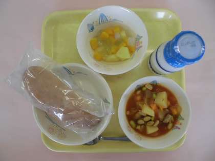 今日の献立は「米粉ロールパン・牛乳・愛知のチキンビーンズ・愛知のメロンゼリーあえ」です。