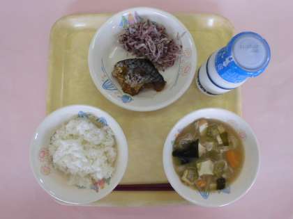 ご飯・牛乳・オクラのみそ汁・さばの香味だれ・赤じそあえ です。