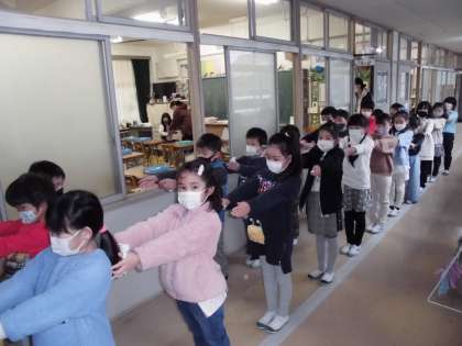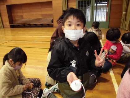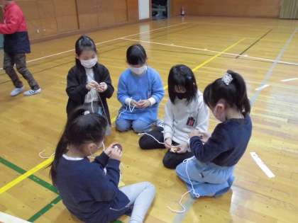 伝承遊びの中の一つ、こままわしをしました。体育館まできちんと並んで行きました。こまにひもを巻くことの難しさが分かりました。
