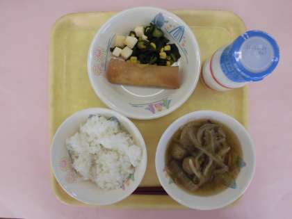 今日の献立は「肉だんごと白菜のスープ・春巻・とうふの中華サラダ」です。