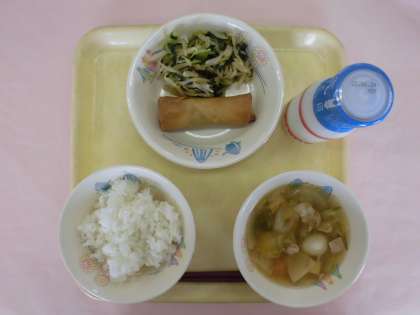 今日の献立は「ごはん・牛乳・ハッポウタン・春巻き・ナムル」です。