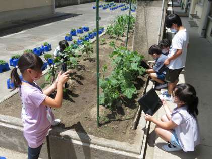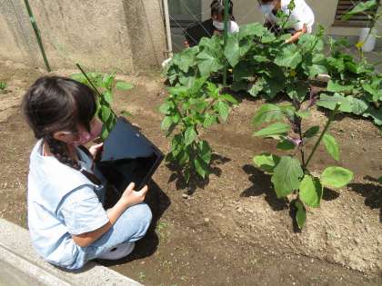 学年園で育てている野菜が、少しずつ大きくなり変化してきているので、生活の授業で観察を行いました。chromebookを活用して、成長の記録を残すために、写真を撮りました。