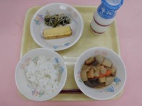 〇今日の献立 ごはん・牛乳・さけの銀紙巻き・つぼ漬け和え・さといものみそ汁・かき...