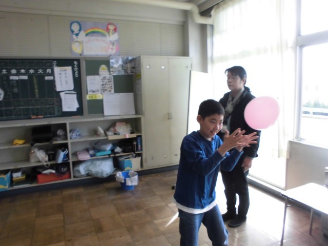 中間放課は外で遊ぶことができなかったため、教室で風船遊びをするなどして過ごしました。