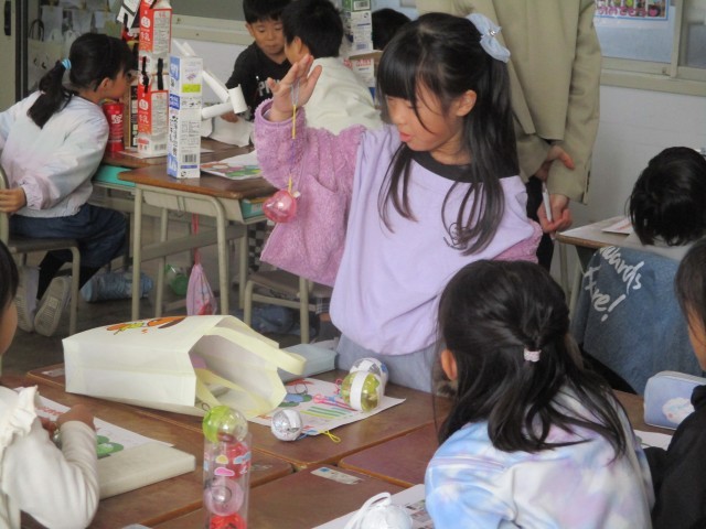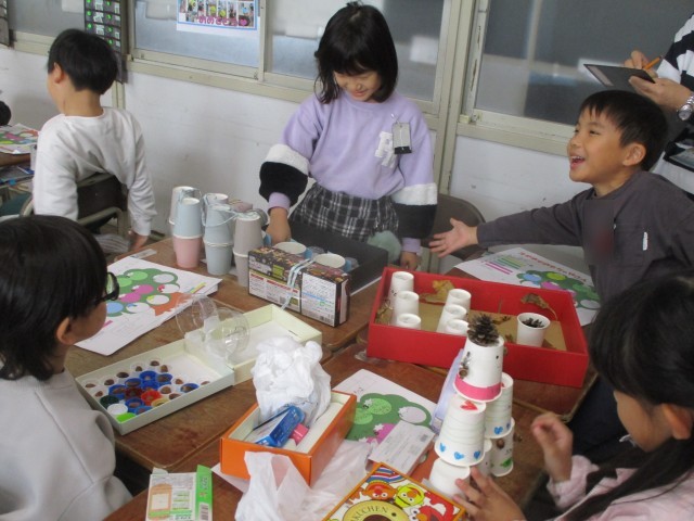 自分が作ったおもちゃの「ステ木」を友だちに紹介します。