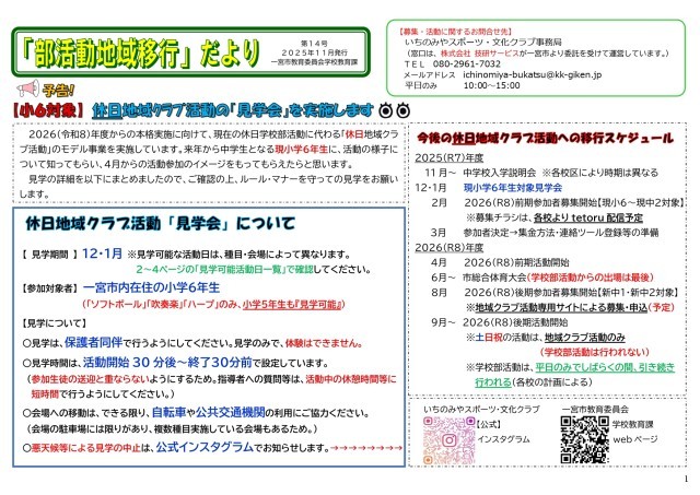 11月28日(金) 休日地域クラブ活動見学のご案内 公開日 2025/11/28 更新日 2025/11/28 6年 小学校6年生を対象に「休日地域クラブ活動見学会」が開催されます。詳しくは次のサイトをご確認ください。休日地域クラブ活動