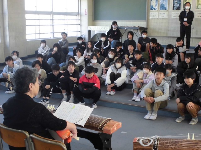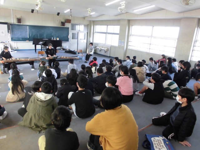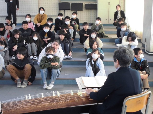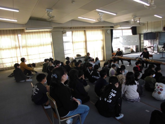 5年生は、音楽室に集まり、箏、尺八、三味線の演奏を聴きました。