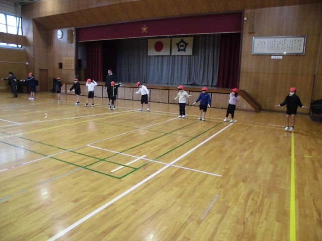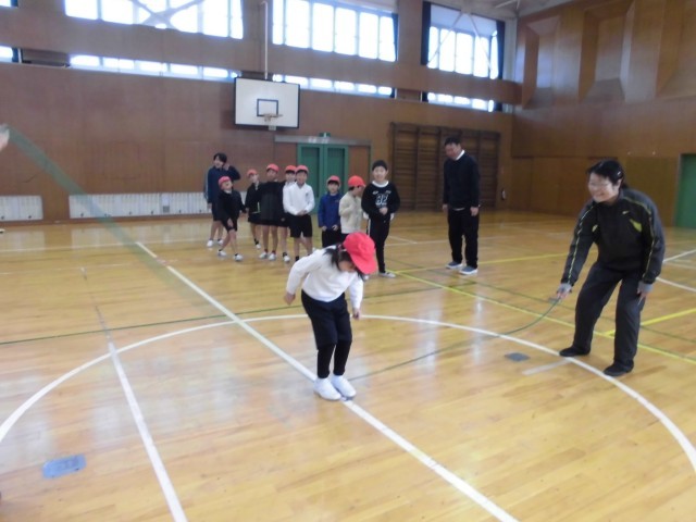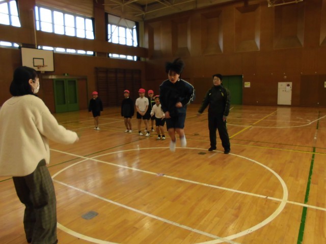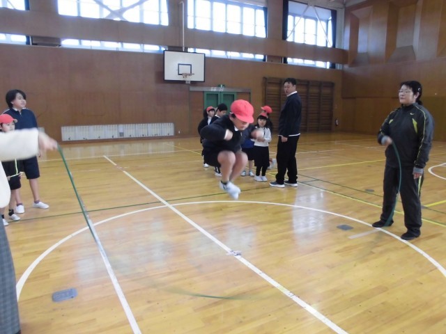 長縄跳びでは、高学年の子どもたちのお手本を見て、低学年の子どもたちがどんどんチャレンジしていく姿がありました。