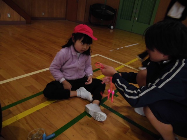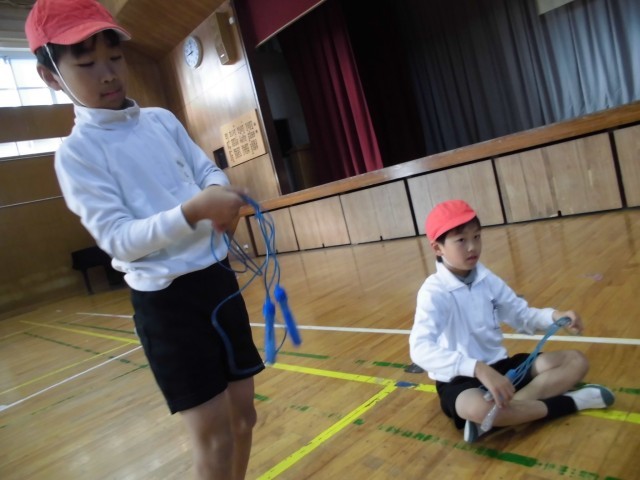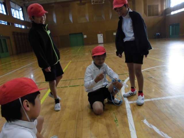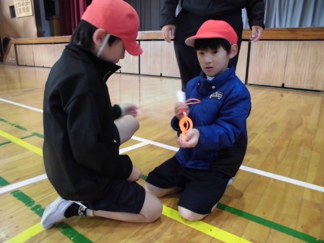 また、短い縄跳びは、自分で結べるように練習をしています。友達同士教え合って結ぶことができました。