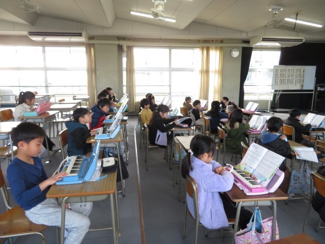 今日の音楽の時間では、ハーモニカの練習をしています。