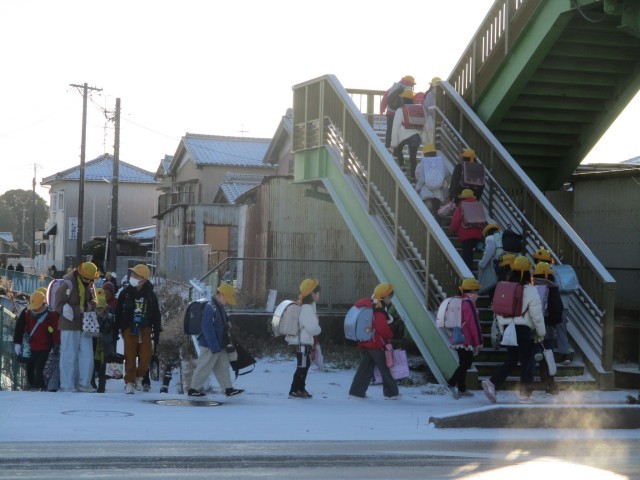 昨夜の雪で路面が滑りやすい状態で、足元に気を付けて登校します