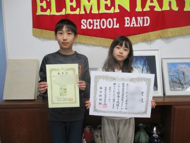 絵ハガキコンクールや読書感想画コンクール、卓球やサッカー大会で優秀な成績をおさめた人を全校で表彰しました。