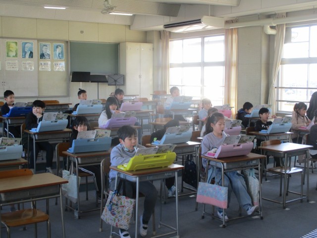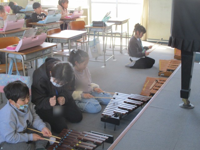 先生の伴奏に合わせて、鍵盤ハーモニカと木琴を使って演奏します