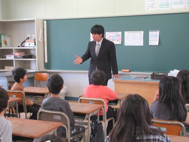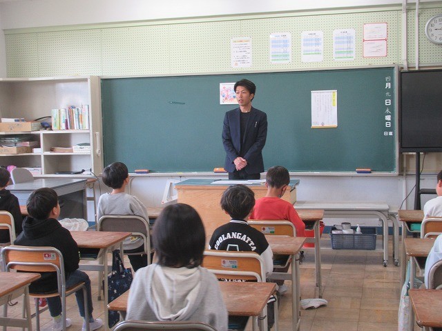 新しい学級になり、新しい担任の先生のお話を聞きます。