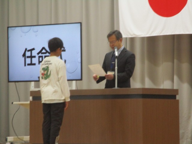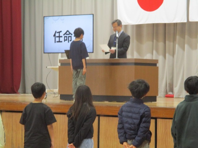 今朝の学校朝礼では、運営委員や学級委員、委員会長の任命式がありました。