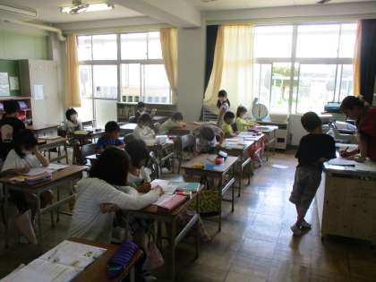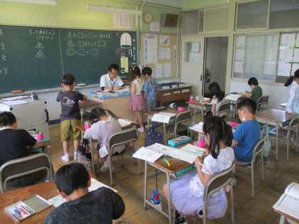 算数では、計算問題を中心に取り組みました。みんな集中して問題に取り組んでいる様子でした。問題ができたら先生に見せに行き、間違えたところがあったら教えてもらいました。