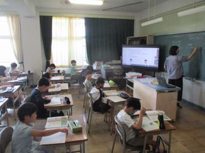 1組は、算数で図を使って計算を求める練習をしました。図のかき方を先生と一緒に1つ1つ確認しながら進めました。2組は、体育でプレルボールをしました。今日はゲーム形式で練習をしました。みんな楽しく運動することができました。