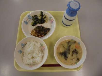 今日は「まごわやさしい」献立の日です。「ま」は 豆類、「ご」は ごまなどの種実類、「わ」は わかめなどの海藻類、「や」は やさい、「さ」は さかな、「し」は しいたけなどのキノコ類、「い」は いもです。みなさん今日の給食で「ま」にあたる豆類を見つけることができますか? 今日は豆乳が「ま」の豆類にあたります。豆乳は大豆をすりつぶし、水を加えて煮詰めたものです。ほかの「まごわやさしい」食材も、どこに隠れているか探してみてくださいね。