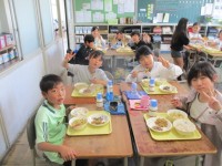 今日は、ビタミンがたっぷりな「もも、パインアップル、みかん」の3種類のフルーツを、ティラミス風のカスタードクリームで和えました。ティラミス風な理由は、カスタードクリームにチーズが入っているからです。 はじめての献立なので、給食の先生を見かけたら、食べた感想を教えて下さいね。