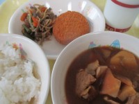 ハッポウタンは、漢字で「八つの宝」と書きます。「8種類」という意味ではなく、「たくさん」という意味です。タンは、漢字で「湯」と書き、スープを意味しています。字の通り、具だくさんのスープです。今日は、豚肉、いか、うずら卵、にんじん、たけのこ、はくさい、チンゲンサイ、しいたけの全部で8種類の具が入っています。しっかり食べて、体をあたためましょう。
