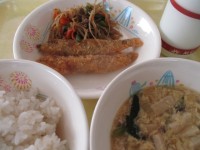 今日の給食は「中華めん・牛乳・しょうゆラーメン(汁)・春巻き・切り干しだいこんのナムル」です。