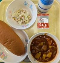 ごはん牛乳ハヤシライスオムレツ蓮根サラダ