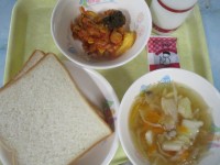 スライスパン・2枚牛乳オムレツ野菜のトマト煮コンソメスープ大豆チョコクリーム(写真は、オムレツの上に野菜のトマト煮をかけています)