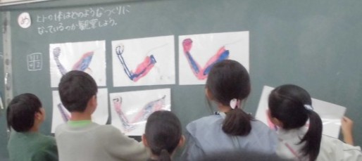 自分の腕を触ってみて、筋肉と骨がどのようについているのかを予想し、グループで同じところを探しつつ、意見を深め、発表することができました。