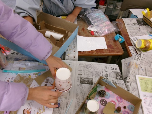 おもちゃ作りが始まりました。たくさんの材料を準備していただき、ありがとうございました。子ども達は一人でじっくり考えたり、友達とおしゃべりをして意見を聞いたりしながら楽しそうにおもちゃを作っていました。