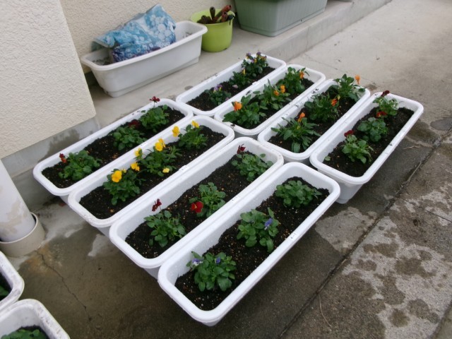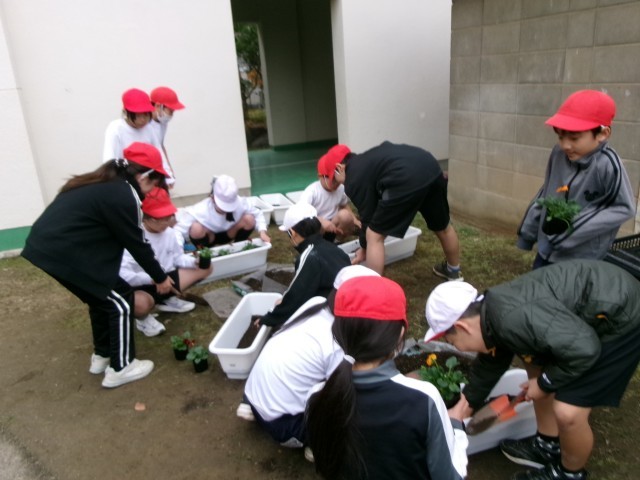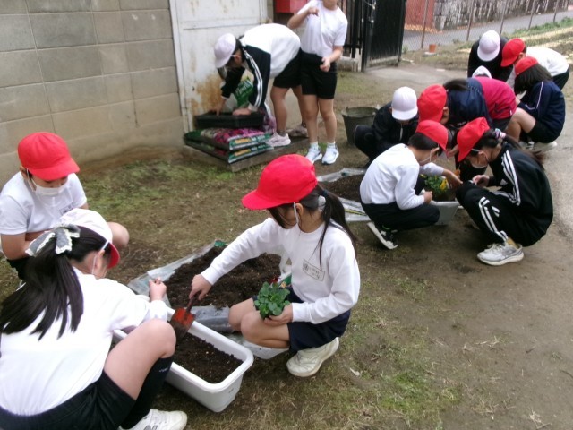 卒業式に飾るビオラをプランターに植え替えました。みんなで協力して取り組みました。