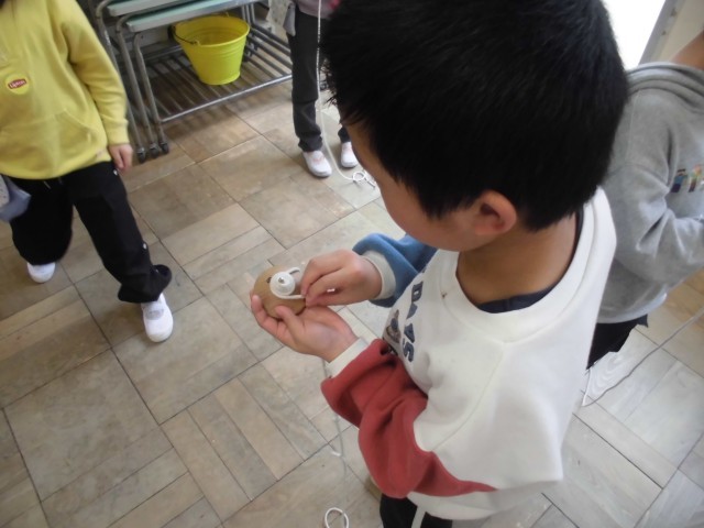 生活科の授業で昔遊びをしました。普段なかなか遊ばない昔のおもちゃに没頭しながら遊ぶことができました。特に、こま回しは難しかったみたいで何度も挑戦する姿が見られました。