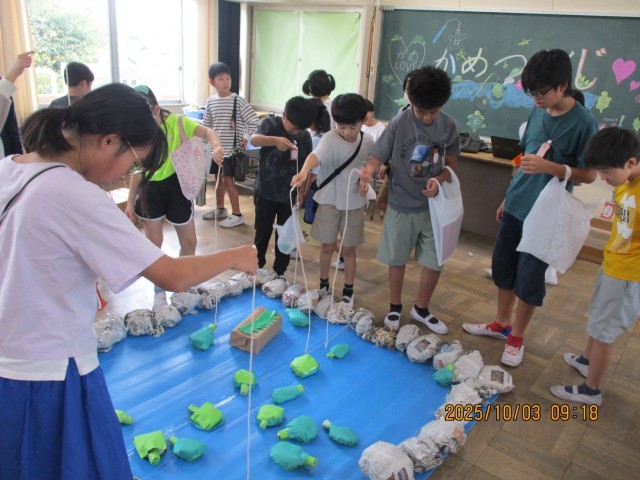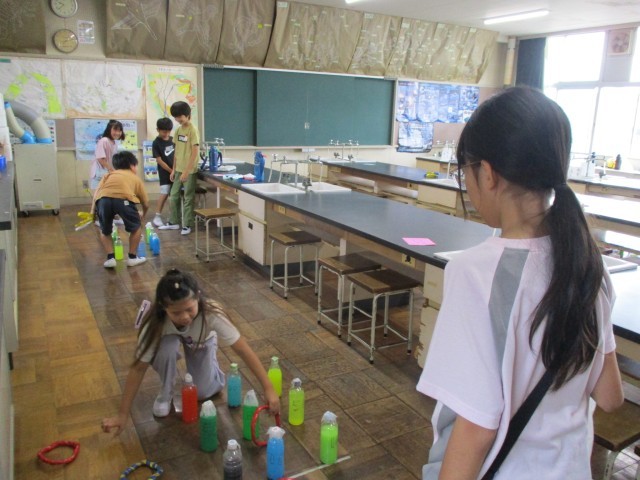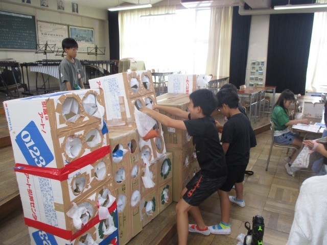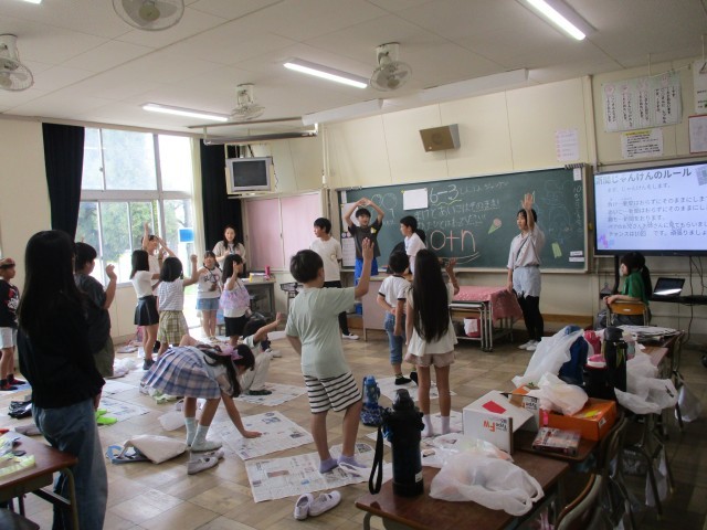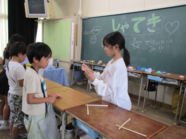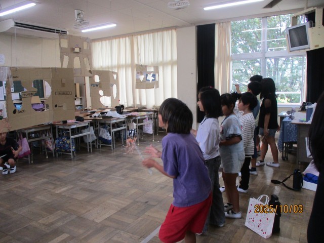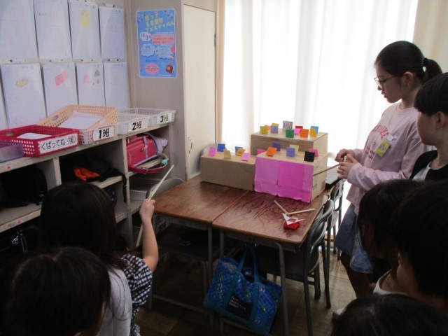 各お店の様子です。4~6年生は、1クラス2つずつお店を考え、いろいろなゲームや劇が楽しめるお店を出店しました。前半と後半の部に分かれ、お店の運営を行う子とペア学年と一緒にお店をまわる子で、交代して楽しみました。1~3年生は、ペア学年のお兄さん・お姉さんと一緒にお店をまわり、絆を深めながら楽しみました。