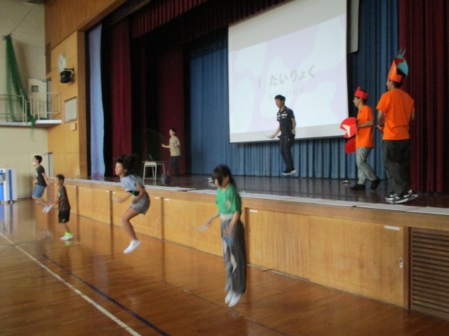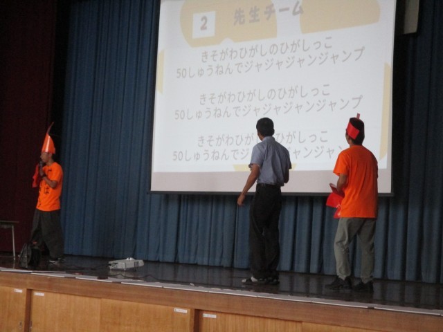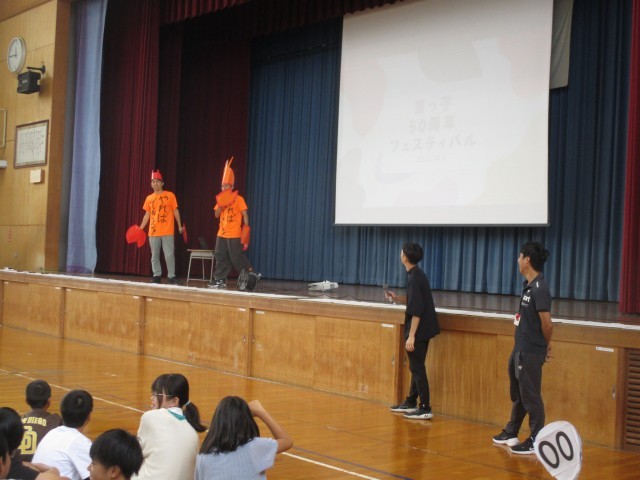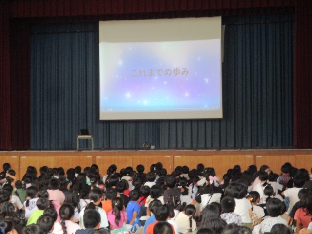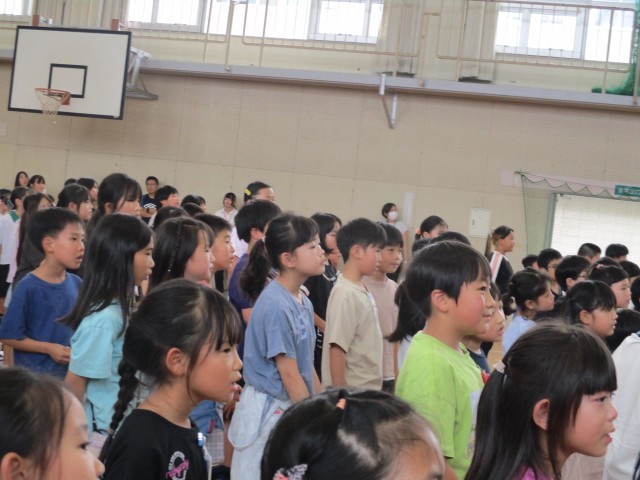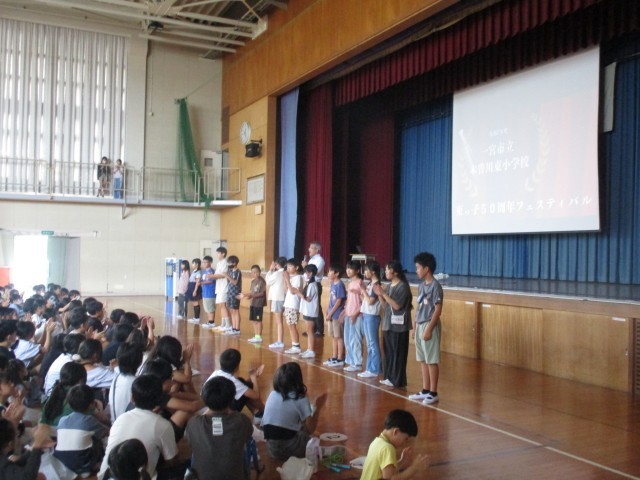 おわりの式の様子です。先生の出し物では、先生対えび・かにチーム(子ども)の対決で盛り上がりました。また、校長先生のお話では、ここまで1からつくりあげてきた代表委員会の児童への感謝の気持ちが伝えられました。そして、ペア結成会やお店作りなどフェスティバルまでの準備の様子や当日の様子がまとめられた思い出の動画をみました。最後には、全校みんなで心を一つの「ありがとうの花」を歌いました。