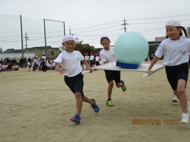 4年生と協力する競争遊戯では、同じ組のチームプレーを活かして見事にスピード良くボールを運ぶことができました。