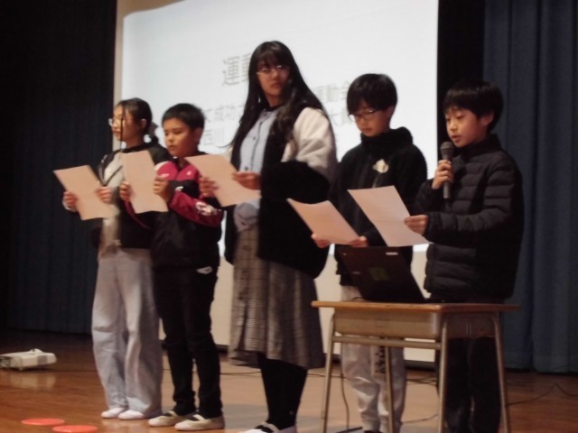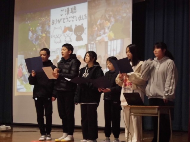 本日、体育館で学習発表会を行いました。いままで学習したことを、班で協力し、調べ、考えたものを、スライドにし、原稿を作り、当日に向けて準備をしてきました。本番では、どの班も堂々と発表することができました。
