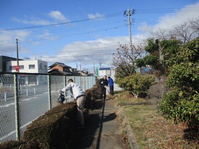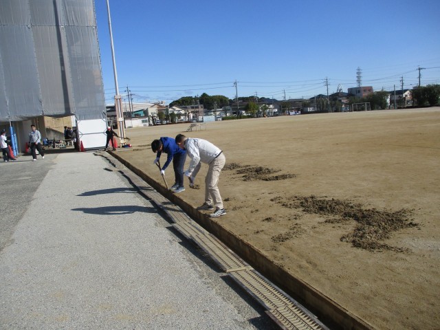 運動場の側溝に溜まっていた砂だし。花壇の草取り、樹木剪定をしていただきました。