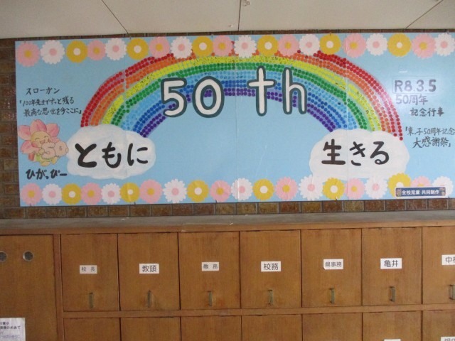 3月5日に行われた東っ子50周年記念大感謝祭の時に全校児童で制作した共同作品が完成し、本日職員玄関に掲示しました。今後長く飾ります。制作にかかわった児童が将来本校を訪れて、自分の名前を探す日が来ることを楽しみにしています。