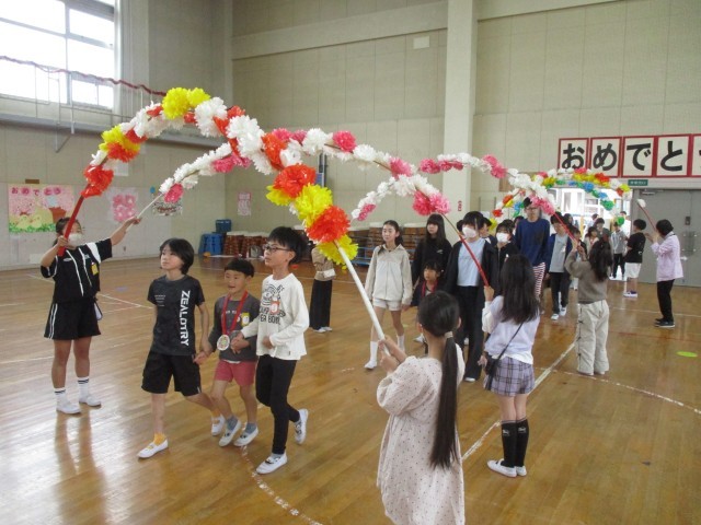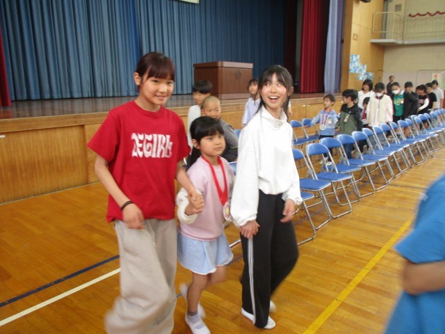6年生から1年生にメダルのプレゼントをして、1年生と一緒に手をつなぎ、入退場をしました。