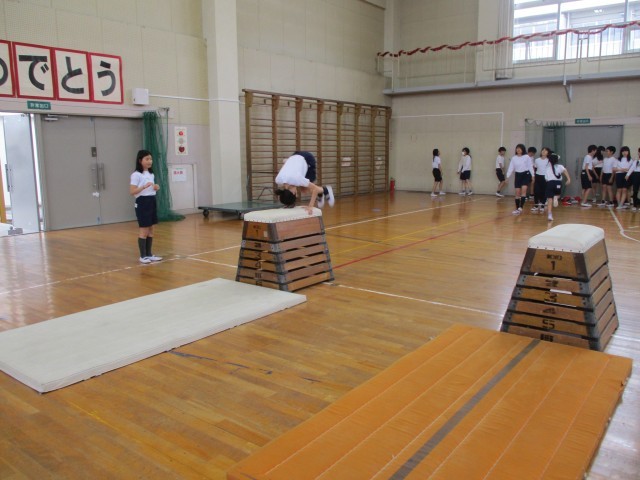 台上前転にチャレンジしました。自分に合った練習の場を選び、技のポイントを意識して取り組んでいました。仲間とアドバイスをしたり、励まし合ったりしてがんばる姿が見られました。