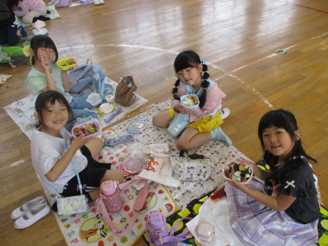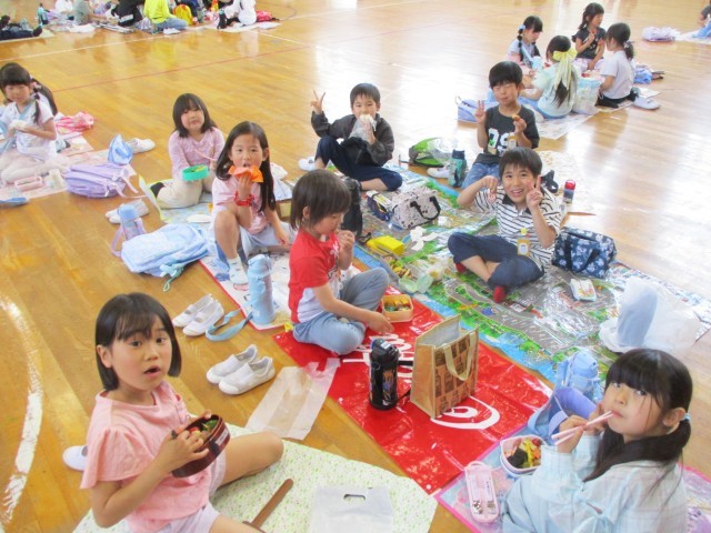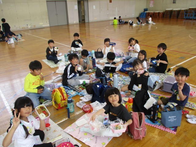 今日は学校の周りにはどんな安全を守るものがあるのか見つけに行きました。また、体育館でみんなでいっしょにお弁当を食べました。みんなにこにこ笑顔ですね。