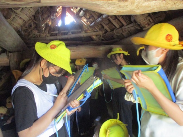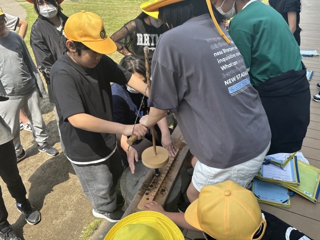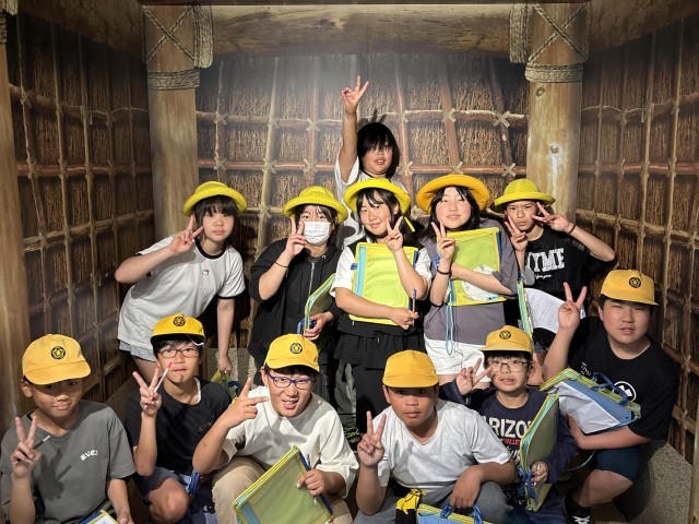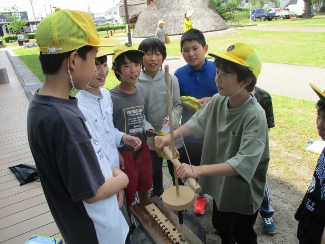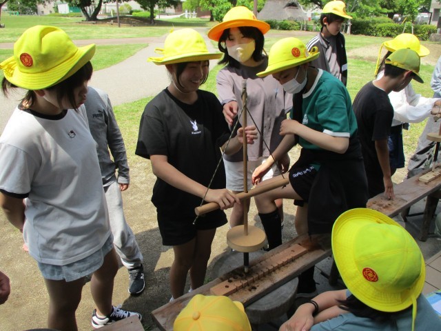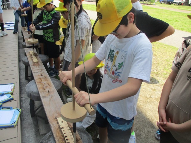 屋外では、外の展示物を見て回ったり、火起こし体験をしたりしました。子どもたちのがんばりで多くの子が火をつけることができていました。