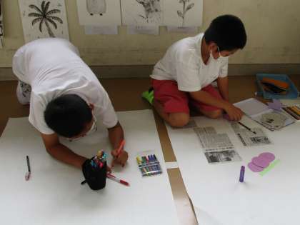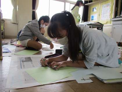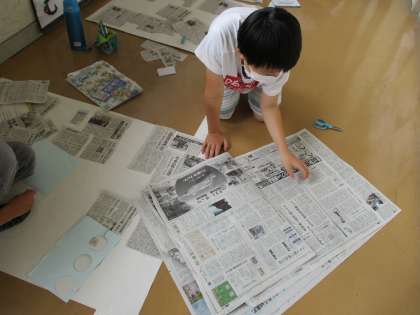 休校中から準備してきた「新聞切り抜き作品コンクール」の作品づくりが、いよいよ始まりました。子どもたちは、自分の体より大きな方眼紙に立ち向かい、少しずつ自分の思いを形にしています。色紙や色画用紙の色づかいをうまく活用した素敵な作品が完成するように、これからもがんばっていきます。