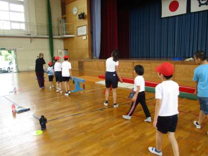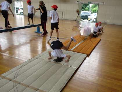 学年に合わせて、前転や壁を使った逆立ち、平均台でバランスを取ったりと、しっかり取り組みました。