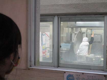 今日は1年生が、給食室が見える窓からドライカレーを作る様子を見学していました。大きな釜やしゃもじを使って調理する姿に興味津々。調理員さんの愛情が伝わって、おいしさも倍増の給食となりました。