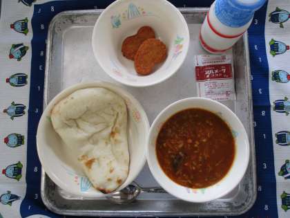 今日のこんだては、ナン・牛乳・地元野菜のドライカレー・大豆ナゲット・ココアパウダー でした。